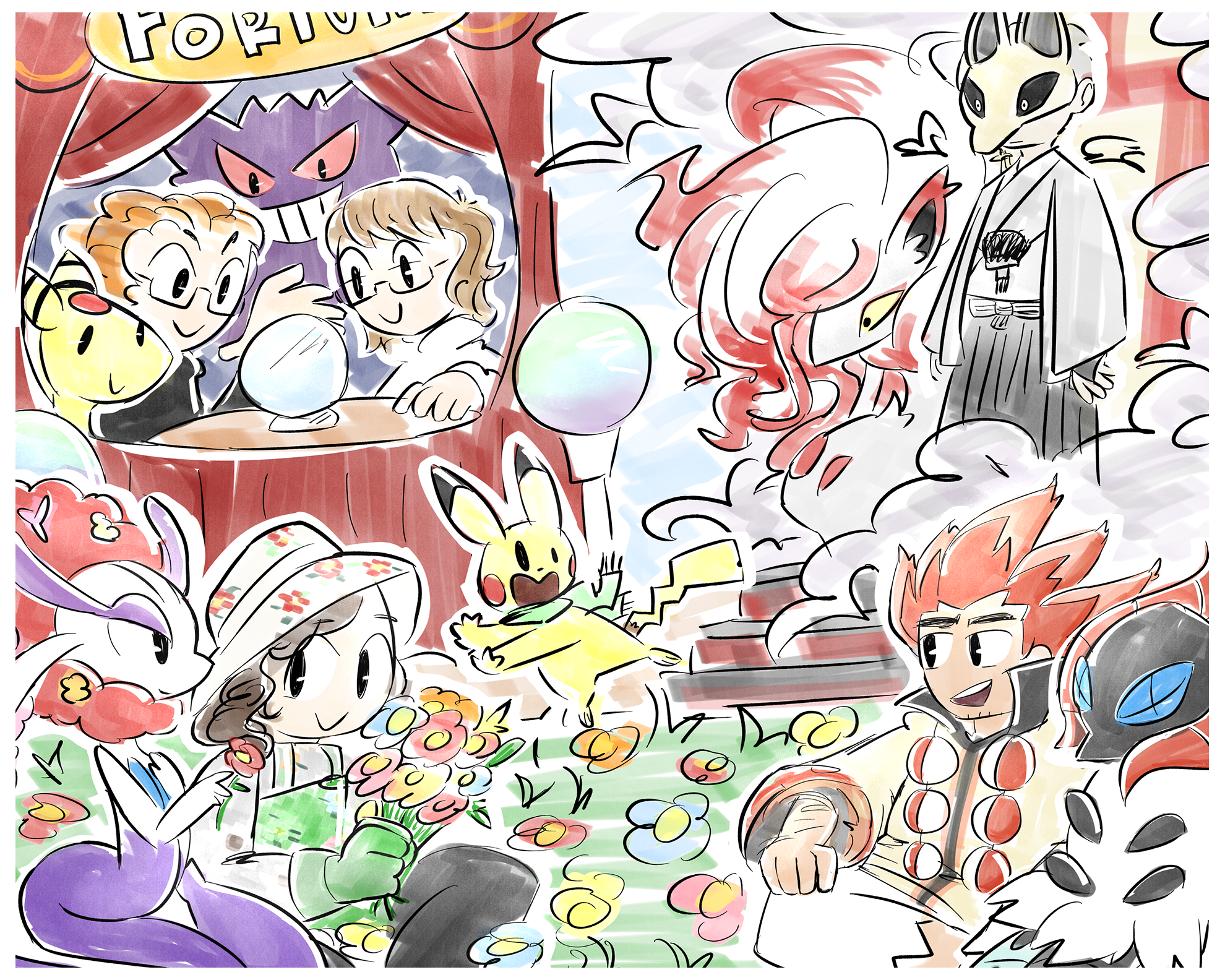 Weal and Woe are travelling fortune tellers who have been partners for many years. Their unique attributes have drawn certain tidings to each of them, with good omens often following Weal, and bad omens often following Woe. To understand each other and their omens better, their partner Pokémon temper theses qualities, with Woe’s Ampharos providing him a beacon of light to cut through the dark, and Weal’s Gengar giving him a deeper understanding of shadow. Together, they’ve come to the PPL to see what the future holds for its challengers… whether it’s what they hope to see or not.